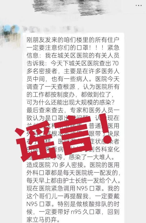 摘要:根据网民举报,经权威部门核实,近期兰州市部分微信圈群里传播的“城关区医院查出70多名密接者”、“现在兰州的这种新型病毒,普通的医用外科口罩根本不顶用”信息为虚假信息